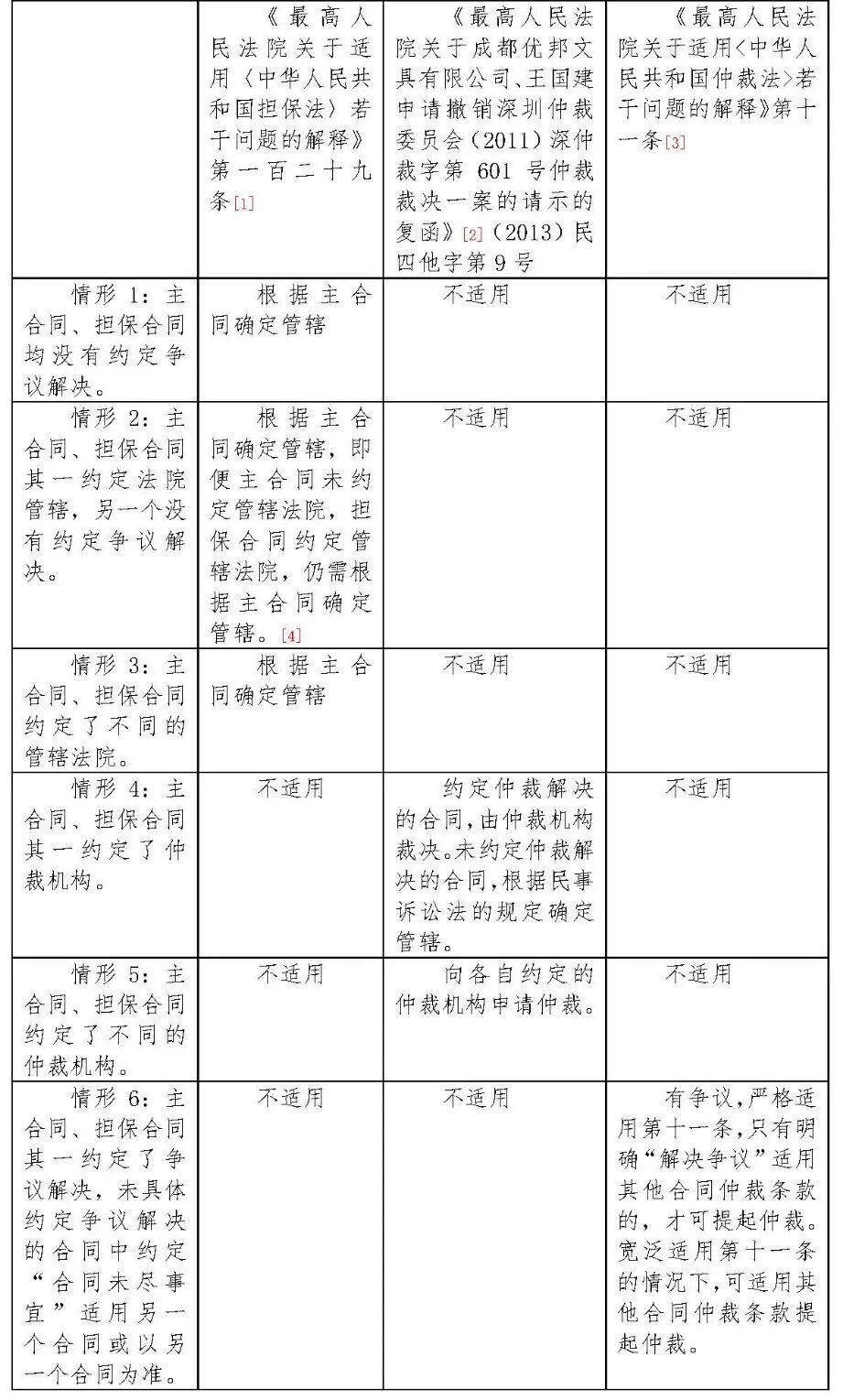 根据排列组合,主合同和担保合同关于争议解决方式可能有以下几种情形:1.主合同、担保合同均没有约定争议解决;2.主合同、担保合同其一约定法院管辖,另一个没有约定争议解决;3.主合同、担保合同约定了不同的管辖法院;4.主合同、担保合同其一约定了仲裁机构;5.主合同、担保合同约定了不同的仲裁机构;6.主合同、担保合同其一约定了争议解决,未具体约定争议解决的合同中约定“合同未尽事宜”适用另一个合同或以另一个合同为准。上述六种情形下应当如何处理,首先用一个图表列示。